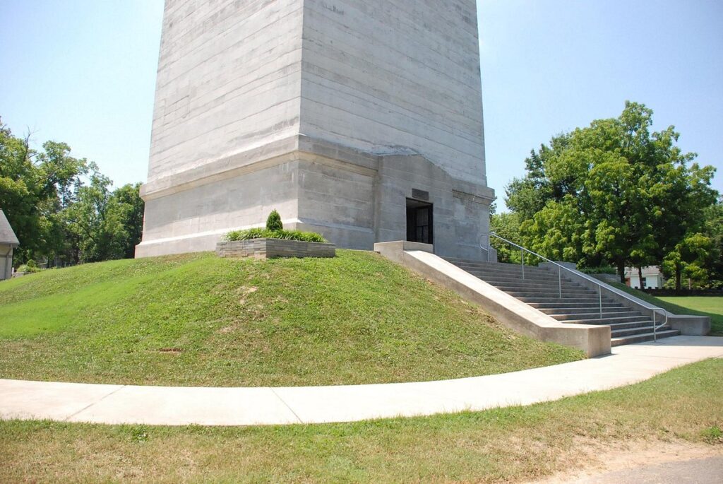 The monument stands 351 feet tall and was the tallest structure in Kentucky until the 1970s. It remains the tallest structure in Fairview. The walls are 9 feet thick at the base and 2 feet thick at the top, where an observation room offers views of mostly unchanged trees and fields since Jefferson Davis’s time. Made of 14,376 tons of solid concrete, it is the tallest unreinforced concrete structure in the world, being without interior iron or steel. It has survived tornadoes and lightning strikes without damage.